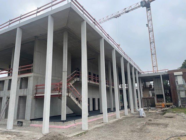 Der Neubau des Versorgungszentrums im Sportpark Wedau schreitet voran. Die Rohbauarbeiten konnten abgeschlossen werden und mit den Stahlbauarbeiten sowie den Dachabdichtungsarbeiten wurde bereits begonnen.